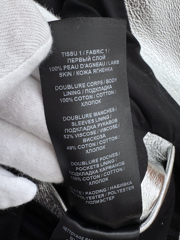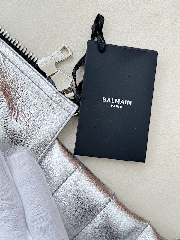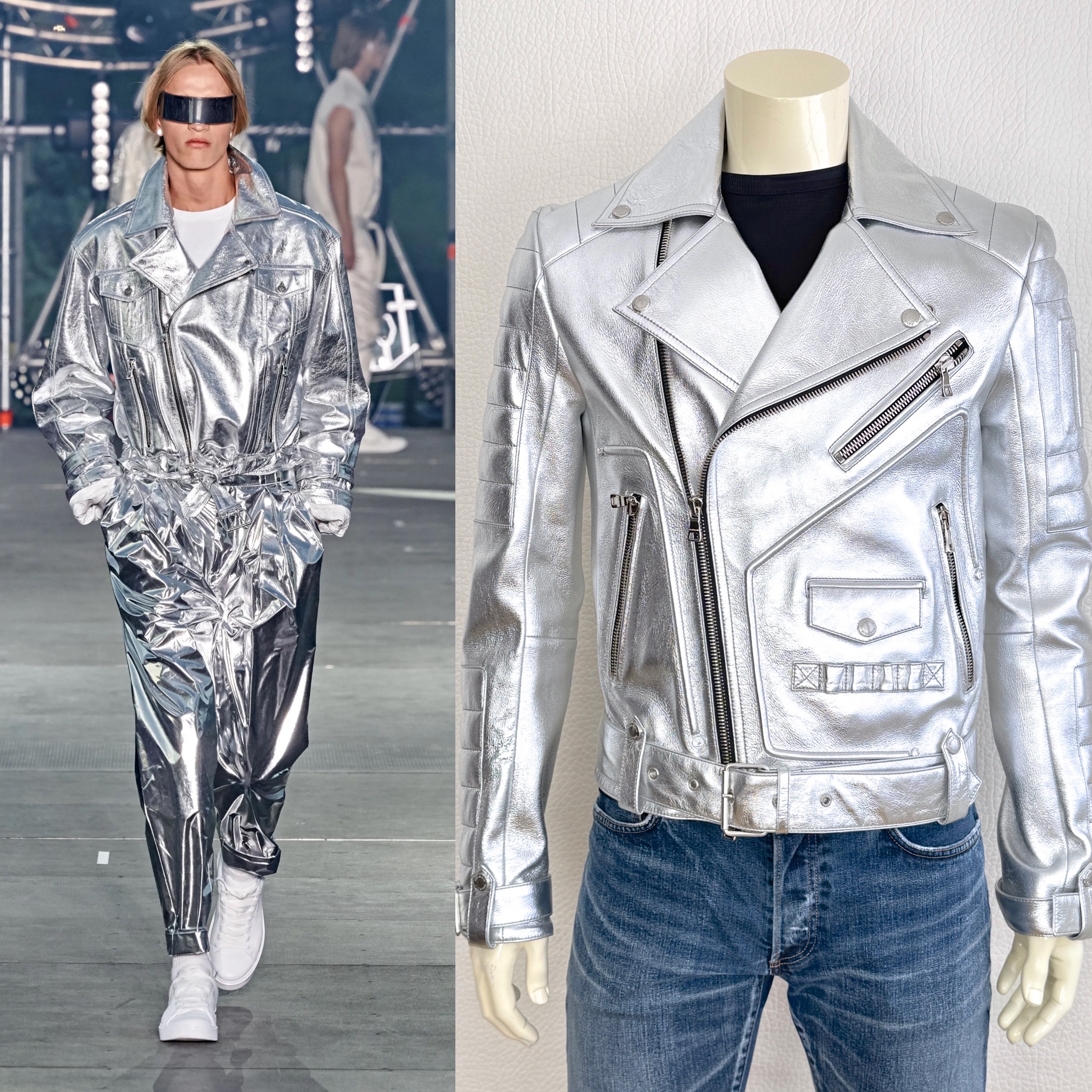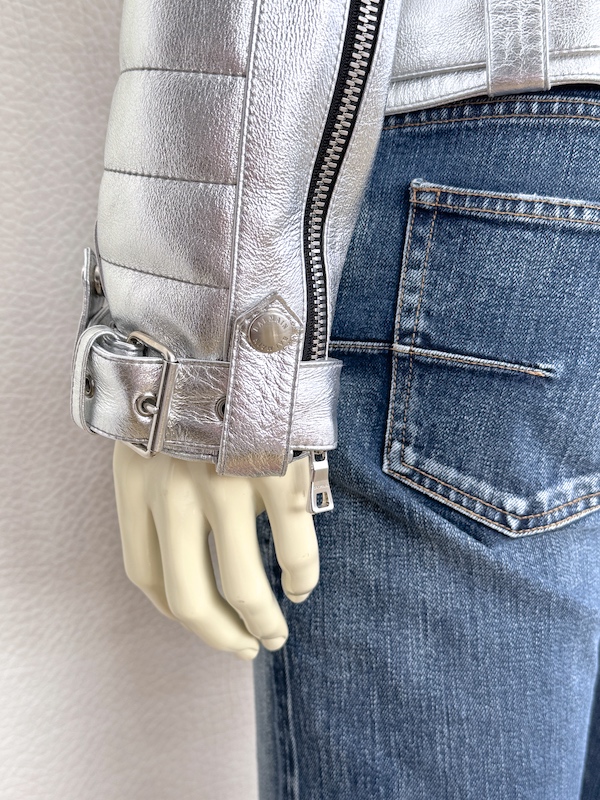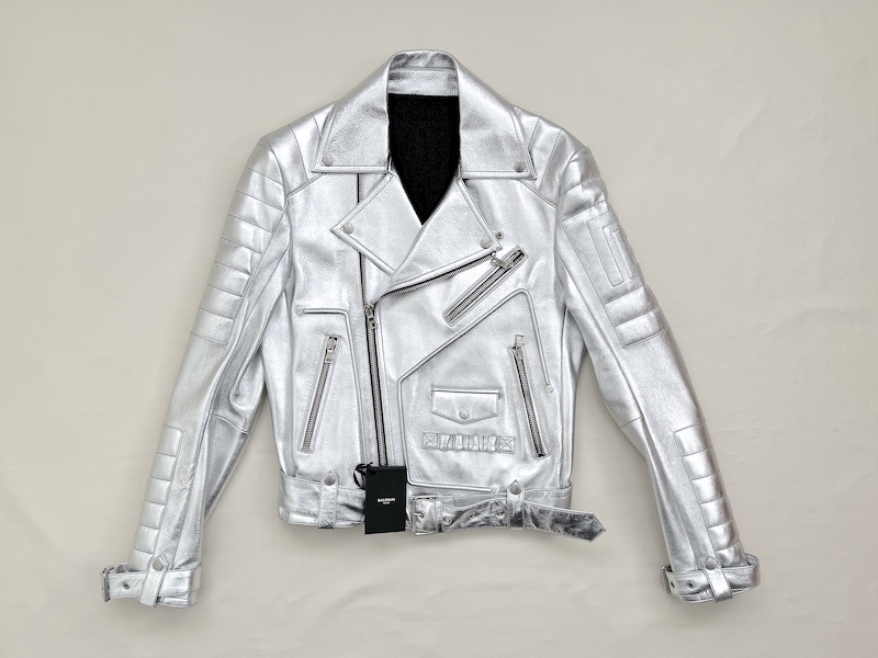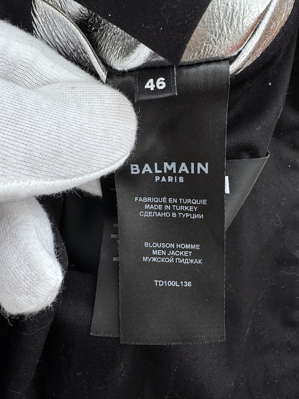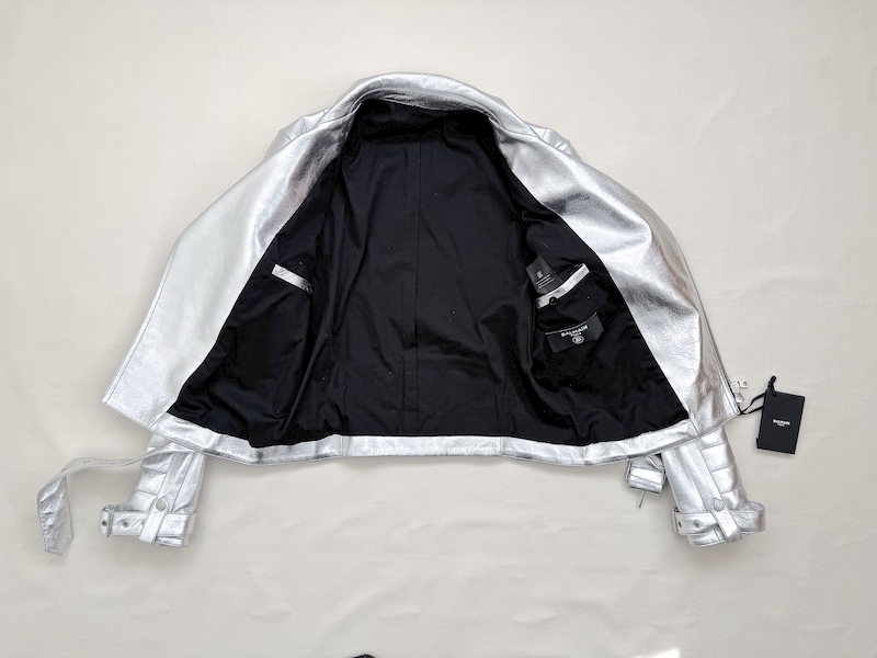 Runway Balmain silver leather biker jacket crafted from 100% lambskin, featuring a bold metallic finish and iconic moto construction. This statement piece reflects the strong, structured aesthetic seen on the runway.