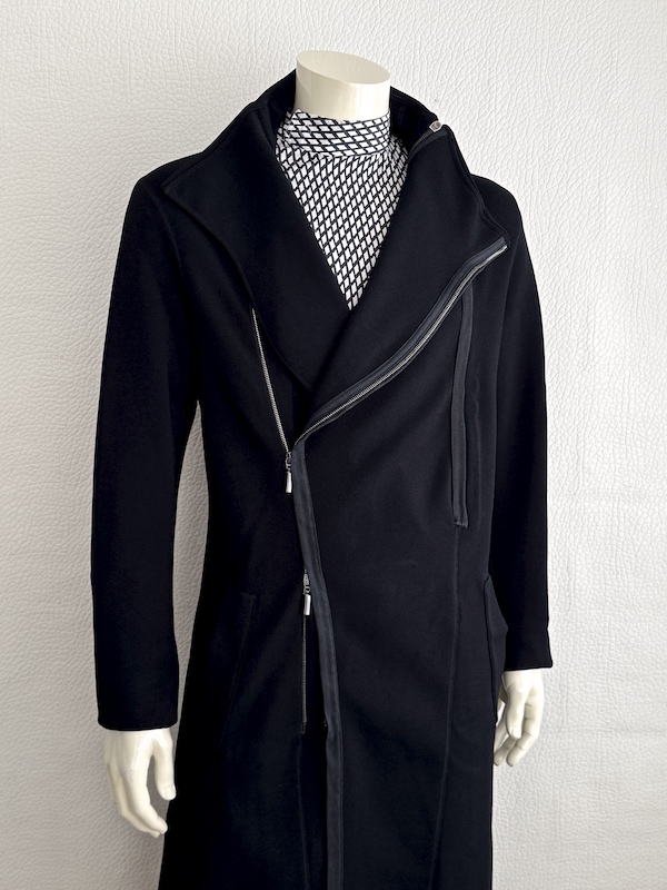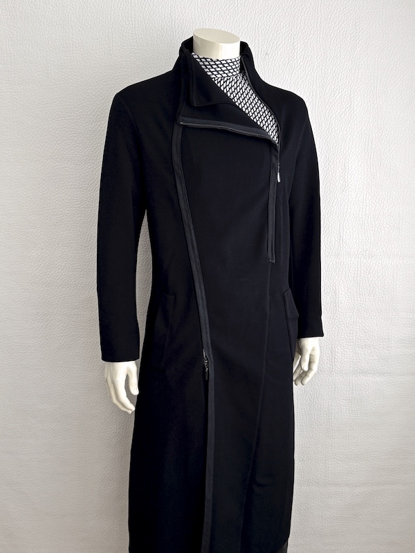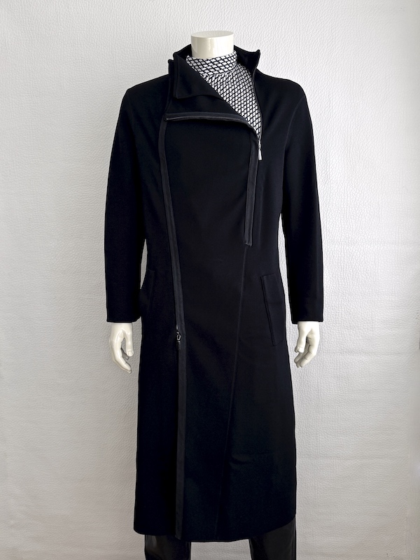 Cut in deep black with a clean, elongated line and an asymmetric front, The high funnel neck can be worn fully closed for a sharper, almost architectural look, or slightly open for a more relaxed, effortless attitude.